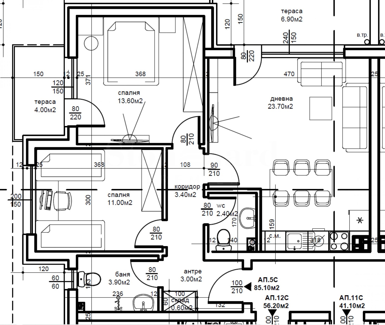 ел. инсталация - трипроводна, хоризонтална и вертикална разводка с монтирано апартаментно табло;