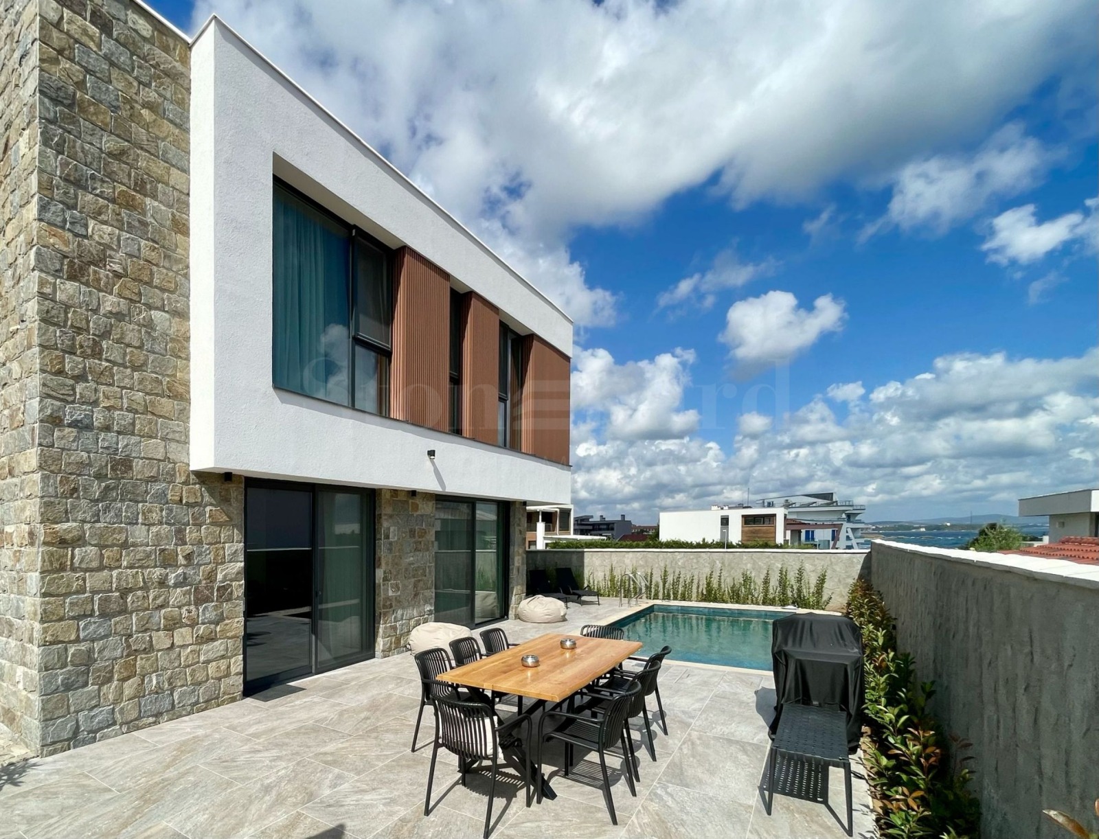 Напълно завършена фасада с минерална силиконова мазилка, естествен фасаден камък и ламели от композитно дърво;