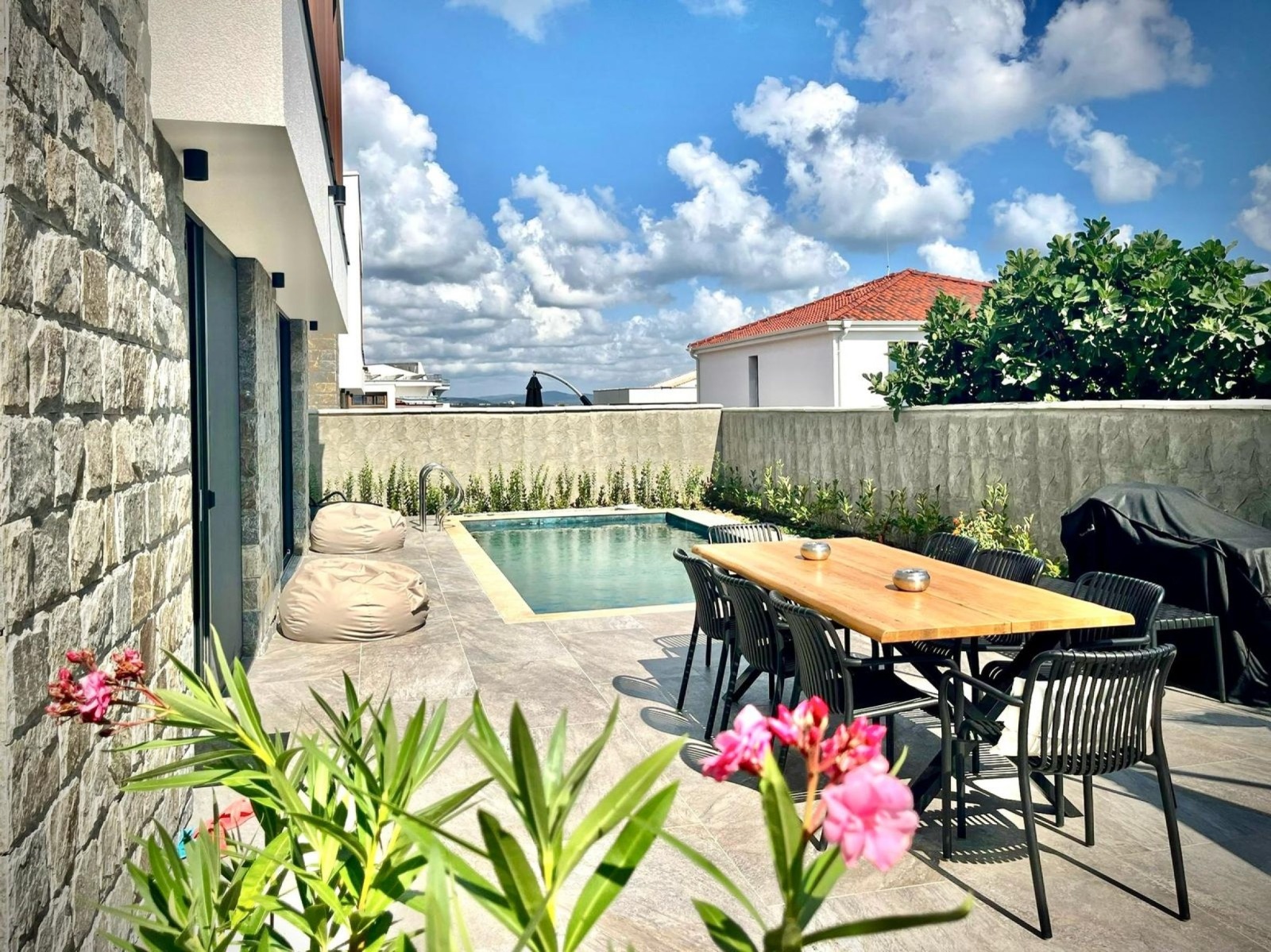Басейн 4/7 м, напълно готов за ползване, с облицовка от испанска керамика и техника с подземно машинно помещение.