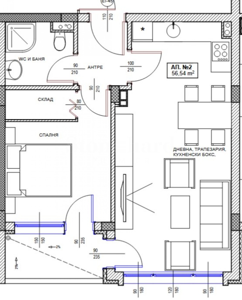 Имотът е с обща площ от 66,44 кв.м, разположен на 2-ри етаж във вход А. Издава се в степен на завършеност до ключ , като има възможност, както за дизайн и мебелиране, луксозни довършителни работи, изграждане на Smart Home , така и инсталиране на зарядни станции за електромобили.