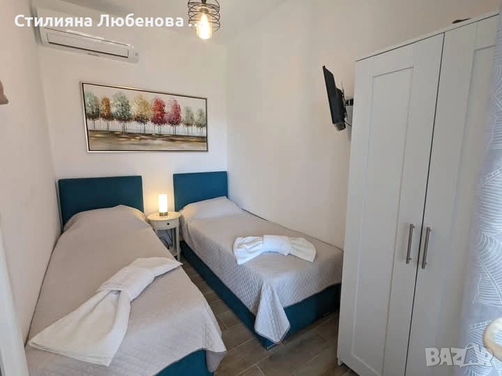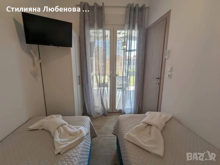 Предлагам за продажба ваканционен имот само на 290 километра от София, на брега на бяло море в курортното селище Паралия Карияни. Имота е подходящ както за лично ползване така и за отдаване под наем.Намира се на триста и петдесет метра от плажа,таверни и магазини.Имотата се състои от парцел с площ от 800 кв. м. с построени в него две вили по 40кв.м. Всяка вила разполага с две спални ,баня и тоалетна и хол с кухня и трапезария.Вилите се продават напълно обзаведени така както е видно от снимките.В имота има също поливна система соларни бойлери , интернет и сателитна телевизия.