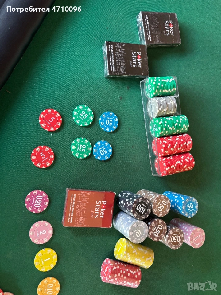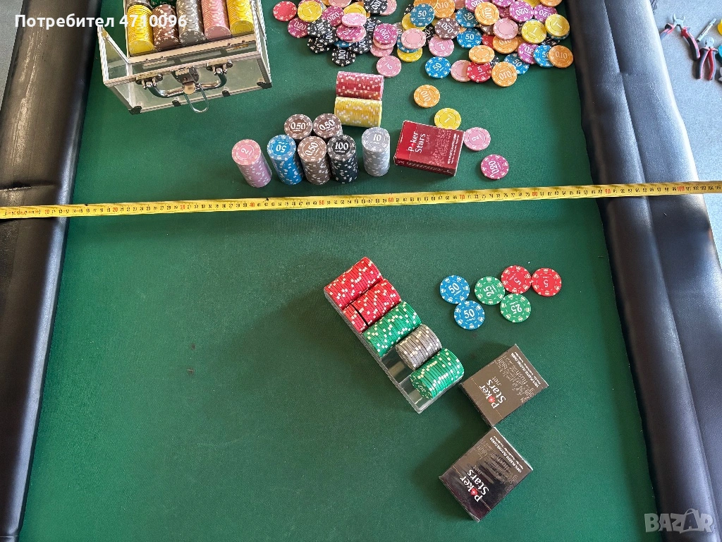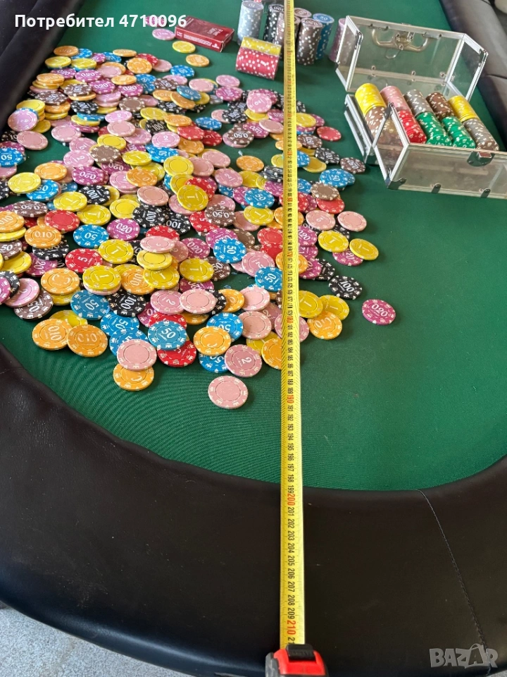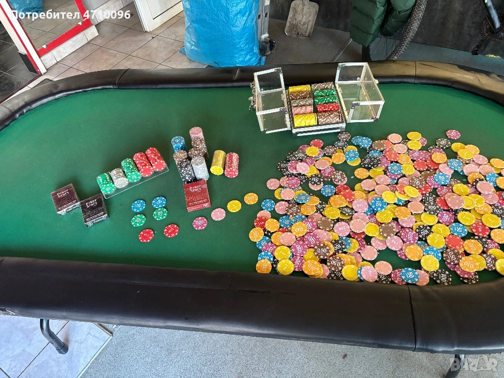 Масата е сгъваема в много добро състояние има нормални следи от употреба към нея давам 2 чисто нови тестета карти и доста чипове към нея който струват 250€ някой са чисто нови не разопаковани забележките и размерите на масата се виждат на снимките.Моля без излишни въпроси