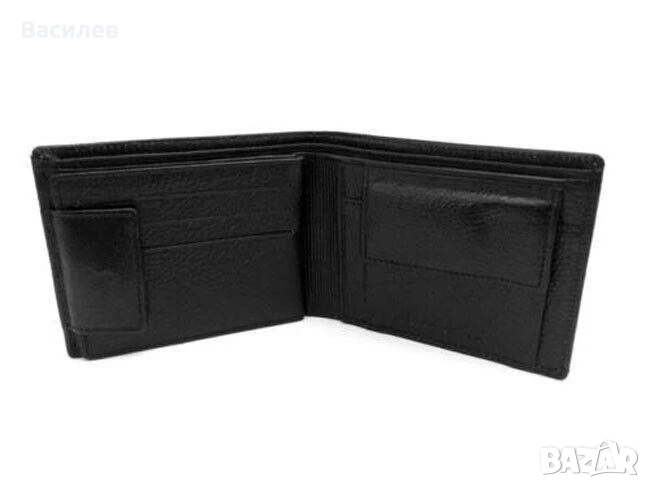 естествена кожа. Разполага с 5 слота за кредитни и дебитни карти, 1 слот за лична карта, 2 слота за бележки, 2 основни отделения за банкноти и отделение за монети с цип. Размери 11,5X9,3 см, цвят черен.