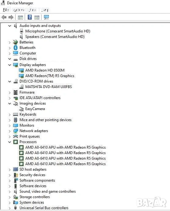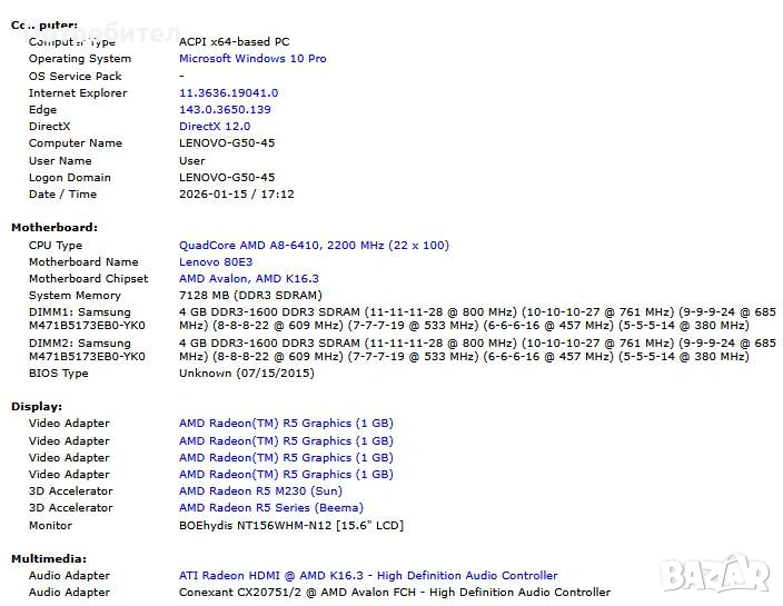 Лаптопът е изключително запазен - Lenovo IdeaPad G50-45 с процесор AMD A8-6410 (4-ядрен, 2.00 - 2.40 GHz, 2MB кеш).