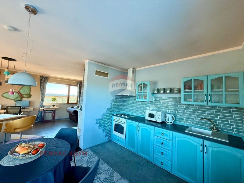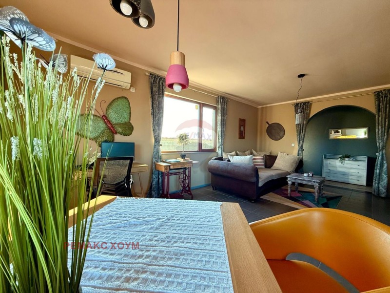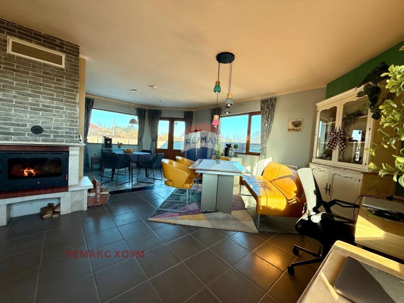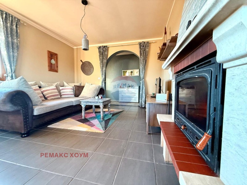 Жилище с хорошим архитектурным видом и современенным элегантным стилем. Из кирпича, есть и внешняя изоляция. Основа самого дома - бетонная плита. Расположение юго - восточное, что делает его очень теплым и солнечным. Отделка дома осуществлена с использованием высококачественных материалов. Монтированы качественные стеклопакеты. Окна большие и их много, что обеспечивает простор и максимальный доступ естественного света во все комнаты. Покрытие пола выполнено из высококачественного ламината и терракоты. Стены и потолки покрашены латексом в приятных и теплых тонах. Крыша в отличном состоянии, есть доступ к пространству между крышей. Дом с очень хорошим функциональным распределением и проектированием. Все комнаты просторные, без переходов. Гостиная удобно зонирована и очень большая. Одна спальня в настоящий момент используется как мастерская/ кабинет. Санитарные помещения также выполнены в сочетании со стилем дома. На веранду и во двор есть выход из гостиной. Отопление комбинированное, что обеспечивает комфортное проживание. Есть камин на дровах, который отапливает все жилище посредством воздуховодов в потолке по всем комнатам. Монтированы современные энергосберегательные конвекторы по периметру дома. Кроме того, есть и мощный кондиционер в гостиной. Инсталированы СОТ, интернет, телевидение и видео - наблюдение. Жилище продается в виде, представленном на снимках, полностью мебелировано и оборудовано всем необходимым для комфортного пребывания и постоянного проживания. Мебель высокого класса и с дизайнерским выполнением, по заказу из Бельгии. Цветове и стила на жилището естетично съчетани с цялата идейна концепция. Интериорът създава усещане за топлина и уют. Налична и оригинальная летняя мебель. Жилище имеет два входа, второй от веранды и двора. Дом построен в 2007 году и полностью реновирован в 2025.