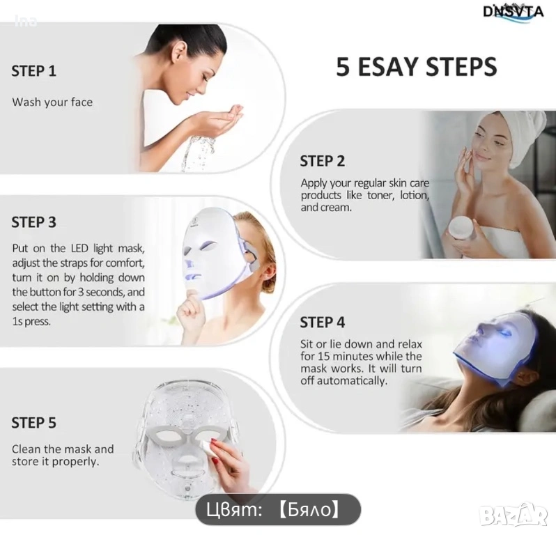 Комплектът включва: LED маска, зарядно устройство и инструкции за употреба.