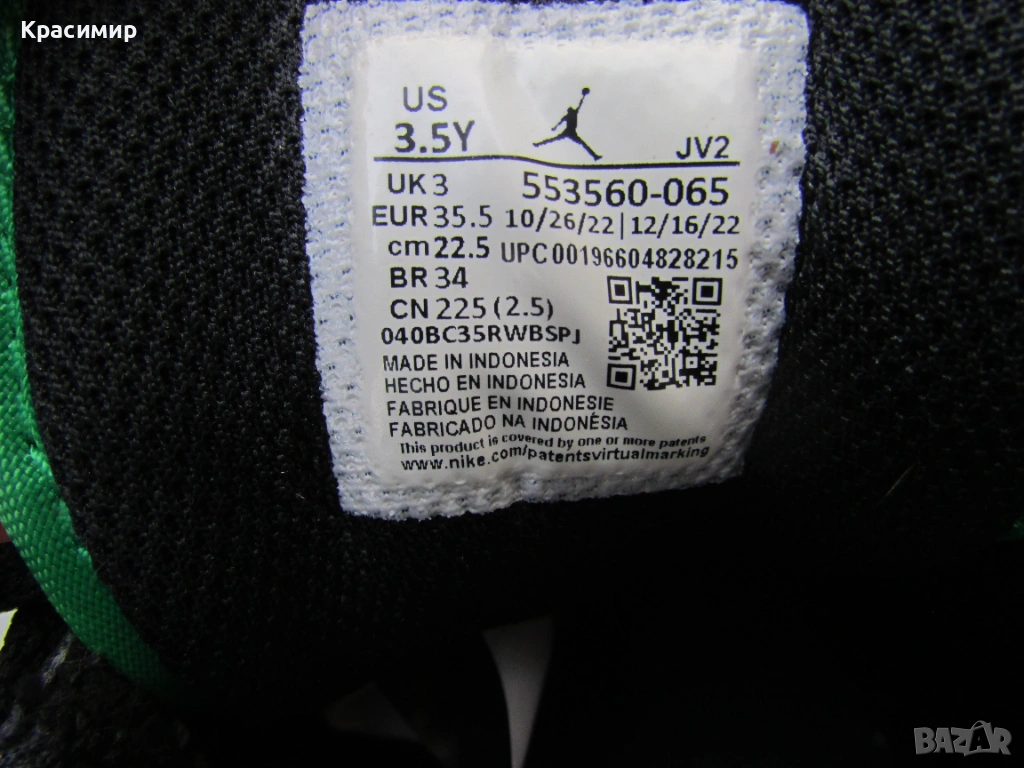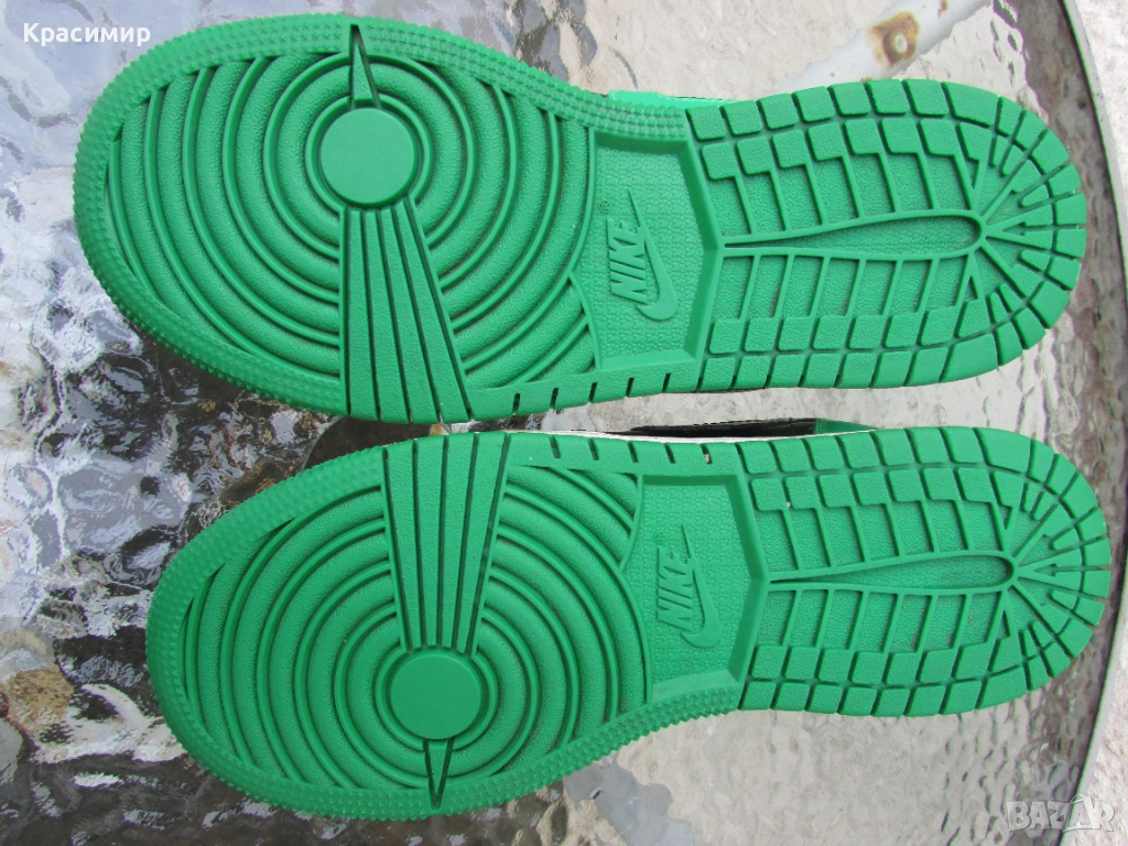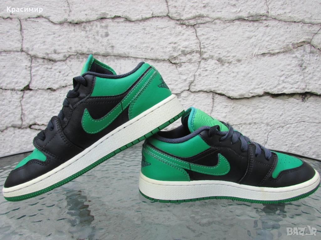 Детски маратонки Nike Air Jordan 1 Low в цвят ‘Lucky Green’, с класически дизайн в съчетание от стил и комфорт. Изработени са от висококачествени материали, перфорирана предна част за вентилация, емблематичното лого с крила на Джордан над петата, междинна подметка с капсулована Air-Sole система за омекотяване, и външна подметка с кръгла шарка за сцепление. За по - голяма здравина, маратонките са шити фабрично по цялата дължина на подметката. Номер 35,5 с дължина на подметката 22 см. Произведени в Индонезия. Маратонките са в перфектно състояние, без забележки.