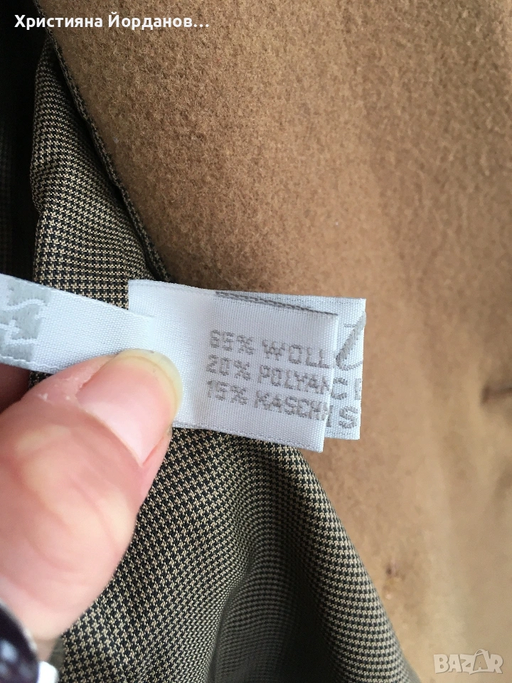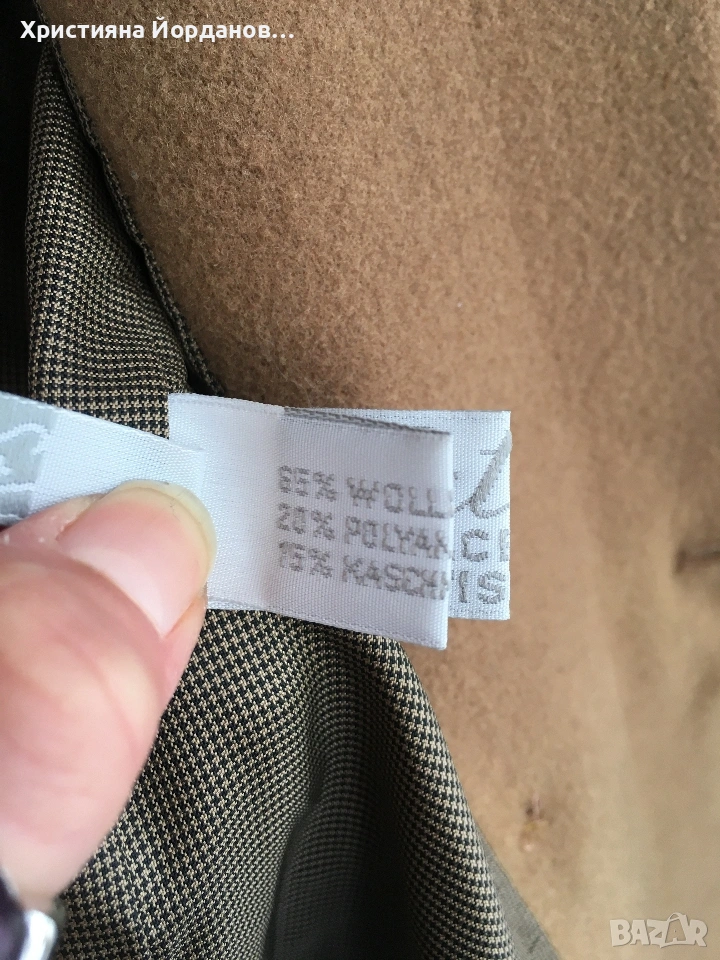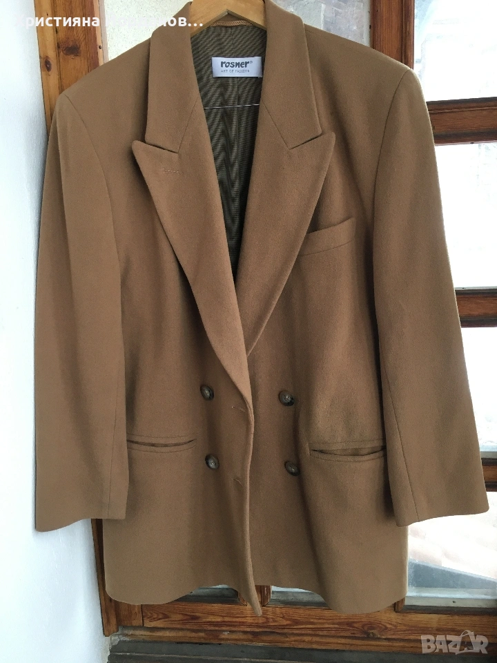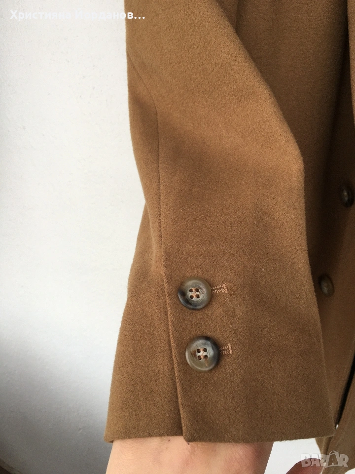 Прекрасно късо палто, тип сако. Двуредно, с две копчета. Размер Л или малък ХЛ по етикет е 42. Високо качество, на пипане е мекичко и топли много. Състав: Вълна 65% , Кашмир 15% и 20% полиамид. В много добро състояние.