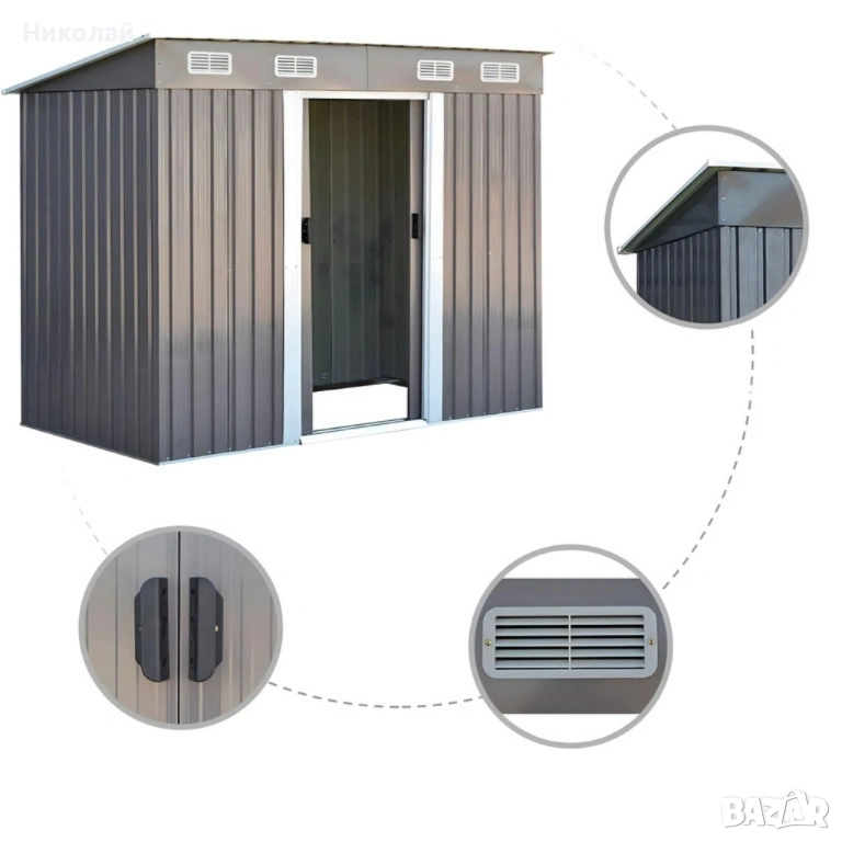 Метална градинска къща за инструменти с вентилация и заключване - малка → Обява 53115501