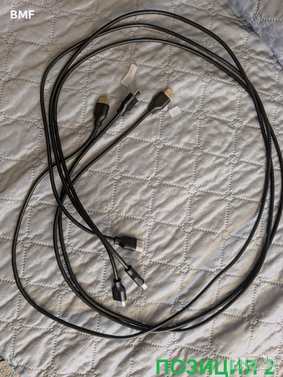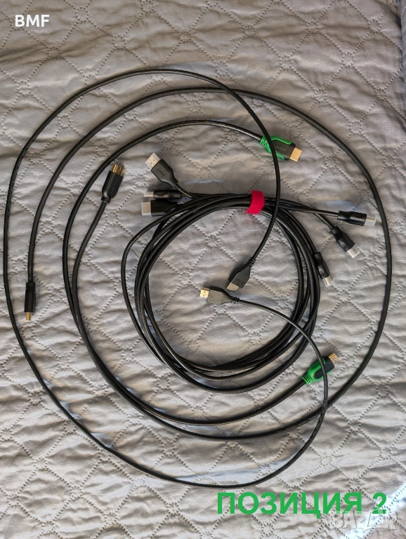 2. Лот от HDMI кабели - общо 6 броя (3х1.5m Philips, 1х1.5m Sonorous с позлатени накрайници, 1х1.5m noname, 1х1.0m Vivanco). На всички без noname пише "high speed hdmi cable with ethernet", което трябва да индикира версията. Всички са тествани на 4К при 60 Hz.