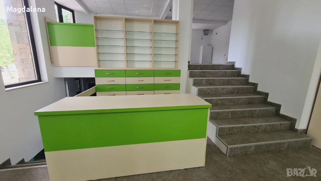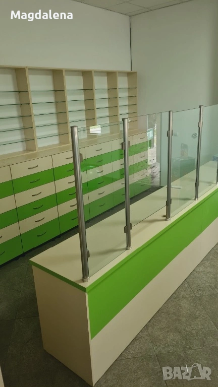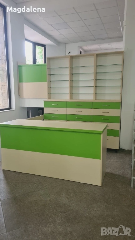 Продавам обзавеждане за аптека или фармацевтично търговско помещение. Мебелите са изработени по проект и са предназначени за функционално, удобно и естетично подреждане на медикаменти, козметика и други аптечни продукти.