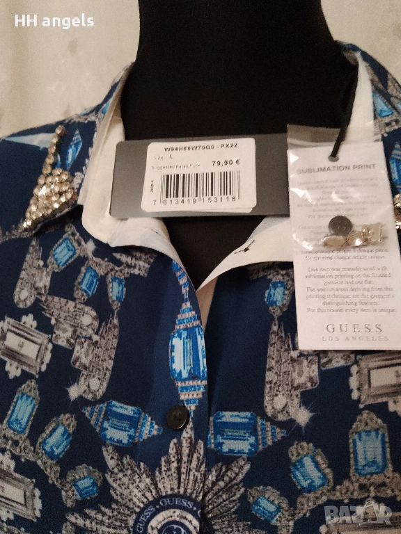 Страхотна риза на GUESS,L размер по етикет,с етикети и редовна цена 79.90 евра.Навсякъде с логото на бранда,100 полиестер,но усещането е като коприна.Дължина 80 см и гръдна обиколка 106 см.Цената е крайна и не подлежи на коментар.С ефектни съшити камъни на яката,уникален модел.