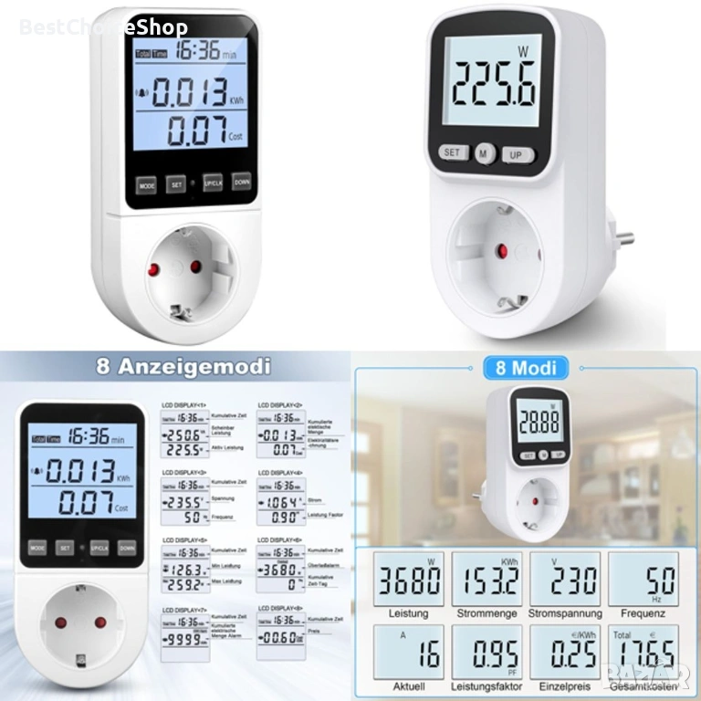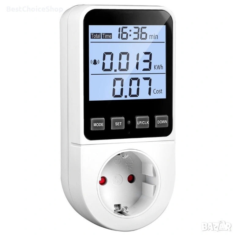 за контакт 8 режима, електромер с измервател на разходите за енергия, измервател на потреблението на електроенергия, ватметър, kWh измервател с време на използване, измервател на мощност с подсветка