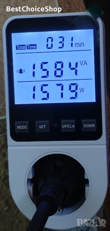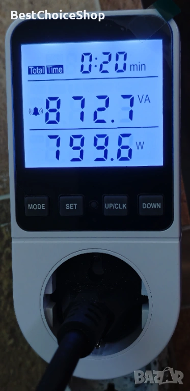 - Дисплей: Разполага с LCD екран, който показва различни данни, като напрежение, ток, мощност и натрупано време.