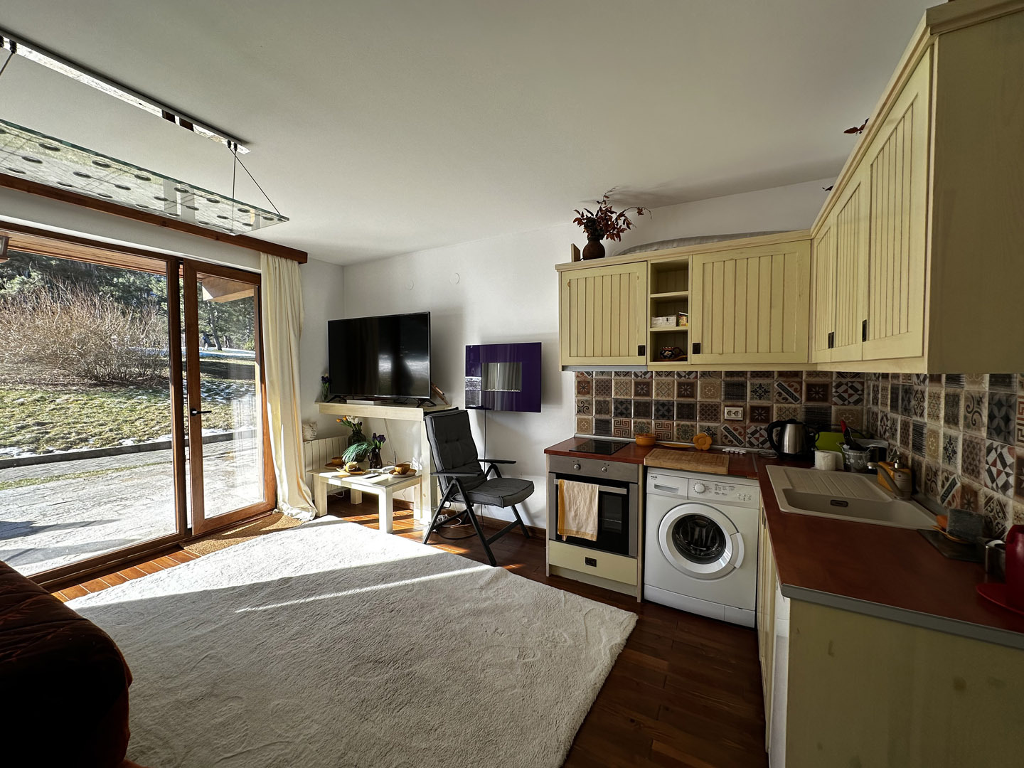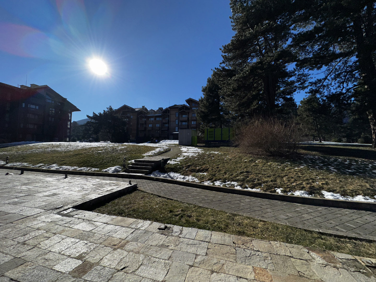 Всекидневната е оборудвана с голяма спалня и мека мебел. Апартаментът има хубаво дворче и има изглед към планината и вътрешността на комплекса.