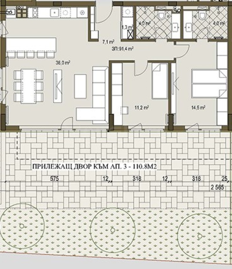 Имотът от 108 кв.м е разположен на партер и има собствен двор 110 кв.м, с гледка към Витоша и парка.