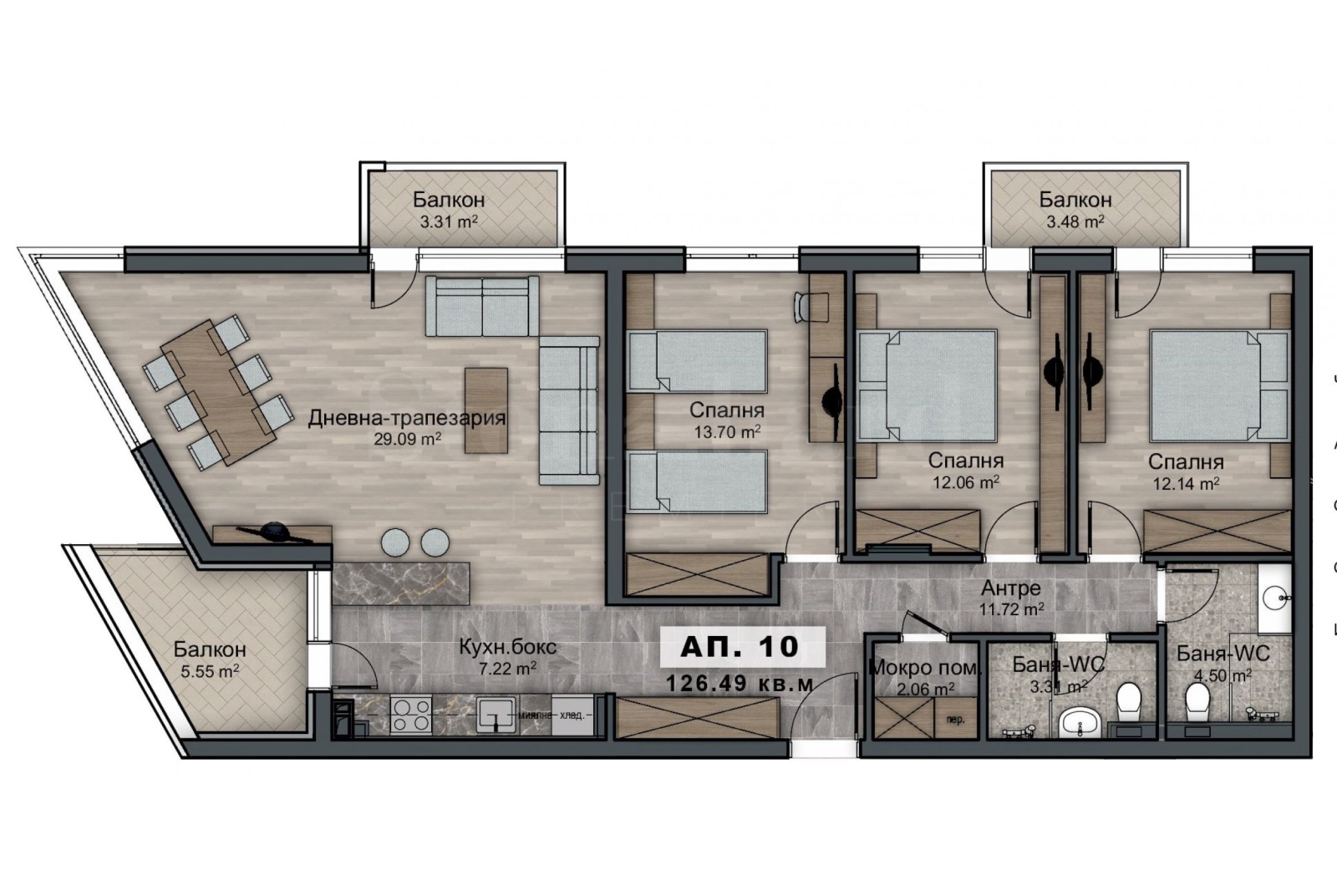 Имотът е ситуиран на 2-ри етаж от общо 6, ориентиран е на юг и запад, и предлага 142.41 кв.м обща площ. Състои се от антре, всекидневна с излаз на две тераси, три спални, две от които са с общ балкон, две бани с тоалетна, килер.