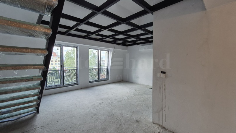 Имотът е ситуиран на 5-и и 6-и етаж и предлага 123.17 кв.м обща площ, разпределена между всекидневна с кухненски бокс, атрактивно вътрешно стълбище, две спални, баня, два балкона.