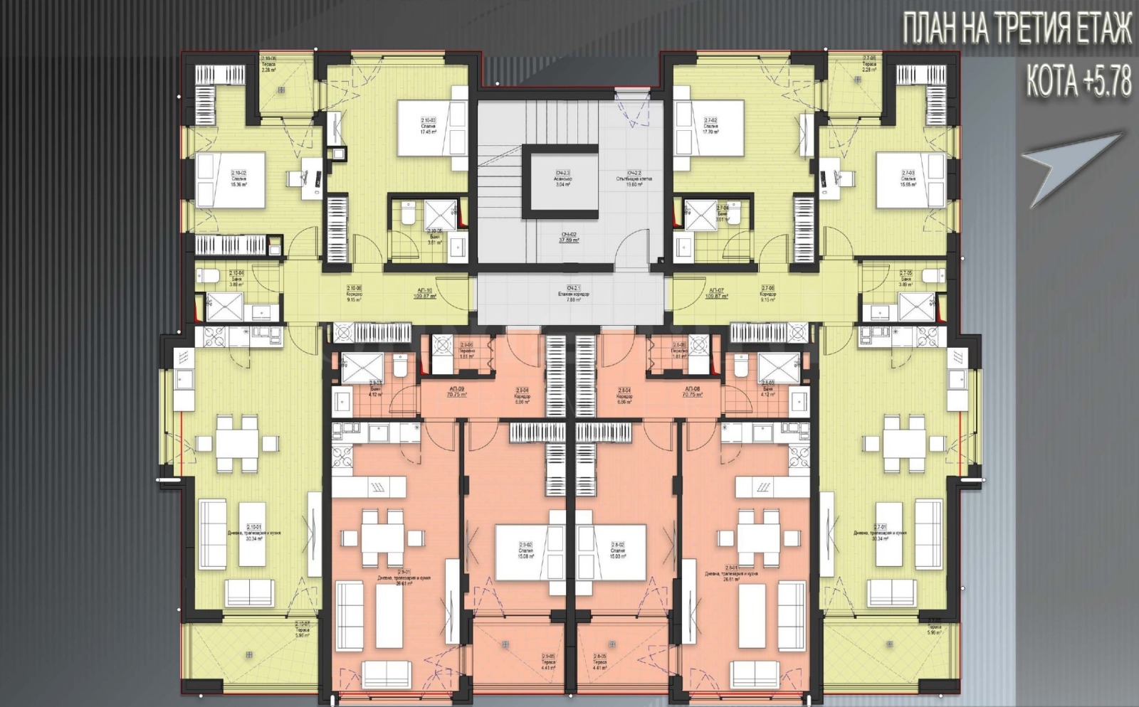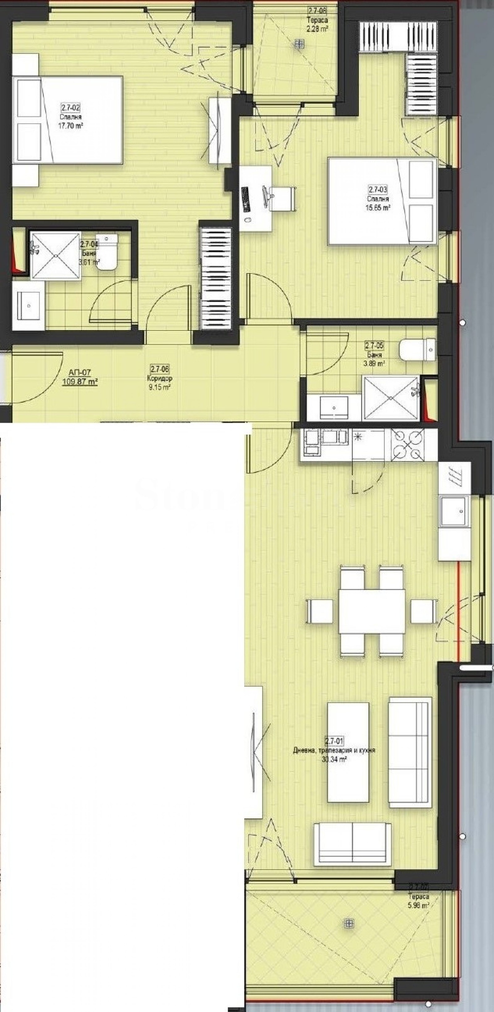 Имотът е разположен на трети етаж и се състои от просторна дневна с тераса на изток и северен прозорец (30кв.м.), две спални със северозападно изложение(15кв.м. и 18кв.м.), едната спалня разполага със собствена баня, тераса на която се излиза и от двете спални, има и втора баня.