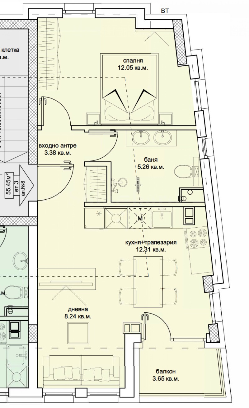 Апартаментът е с обща площ 67.82 кв.м. (нетна площ 55.45 кв.м. + общи части 12.37 кв.м.) и се състои от входно антре, хол с кухненски бокс, 1 спалня, баня с тоалетна и балкон.