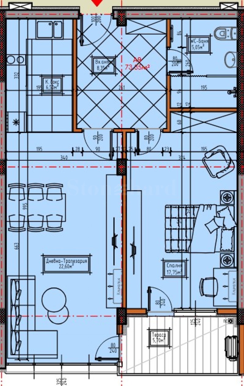Имотът е с обща площ от 103,30 кв.м, разположен на 3-ти етаж със следното разпределение: