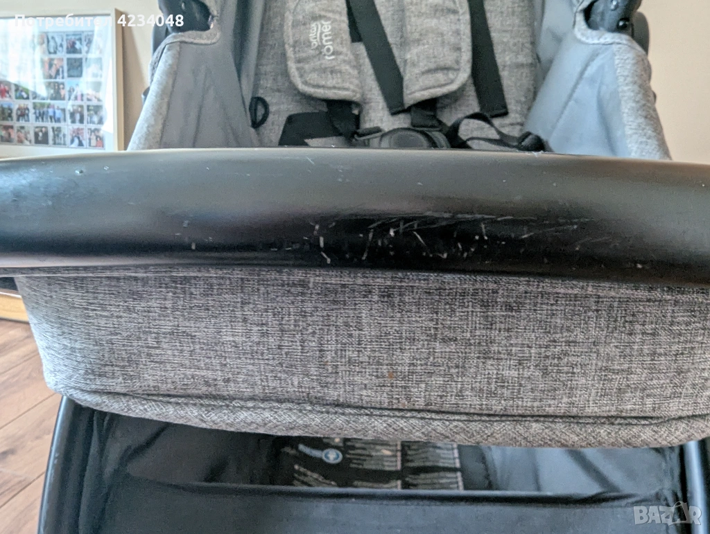 Коша 6+ има леки драскотини по металната част на крачетата и леко обезцветяване по ръбовете на сенника от слънцето( всичко видимо на снимките).