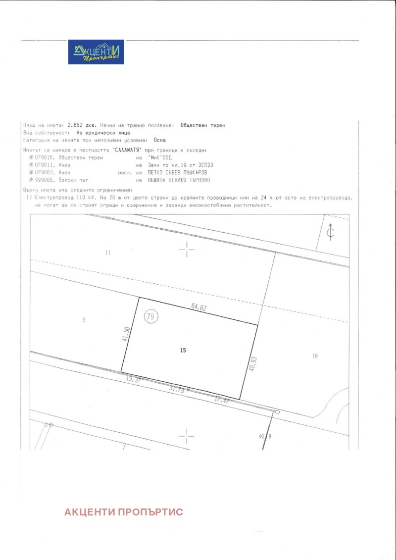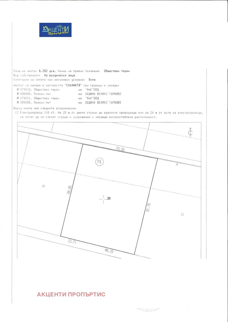 Агенция за недвижими имоти Акценти Пропъртис Ви предлагаме за закупуване парцели, разположени на входа на гр. Велико Търново и с лице на главен път София-Варна.Парцелите са с различни квадратури: 2652кв.м.-лице 65м.; 5827кв.м.-лице 80м.; 4819кв.м.-лице-60м.; 4207кв.м.- лице 50м.; 4335кв.м.- лице 50м.; 6292кв.м.- лице 70м.; 55310кв.м.-лице 270м. Статутът им е за обществено обслужване,производствени и складови дейности. Съгласувана е пътна връзка с Агенцията за пътна инфраструктура за изграждане на локално платно и индивидуален подход към всеки отделен парцел.Номер на офертата 16126.