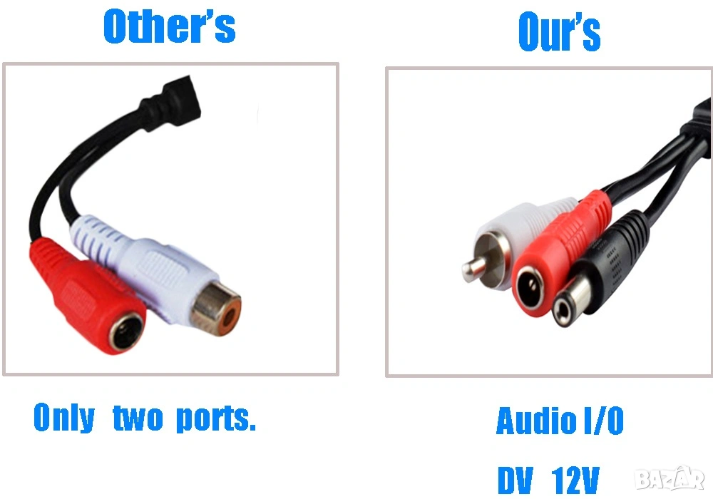 3в1 - Микрофона е с допълнителен кабел с накрайник в който може да влезе захранването, което е предназначено за камерата и след това от самият микрофон има друг кабел с накрайник, който да захрани самата камера. Също така има и Аудио кабел.