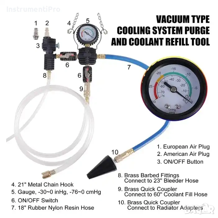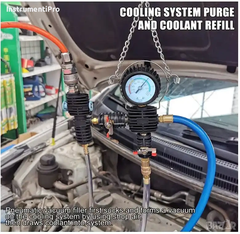 - Комплект за проверка на охладителната система и за прочистване на системата с вакуум