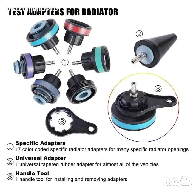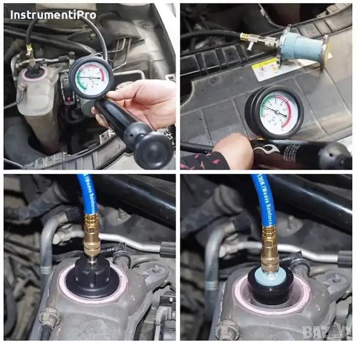- Предназначен за проверка за течове от капачката на радиатора и охладителната система на автомобила