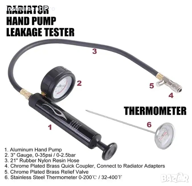 - Помпа за тестване на радиатора под налягане (обхват 0 до 2.5 бара)