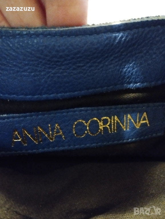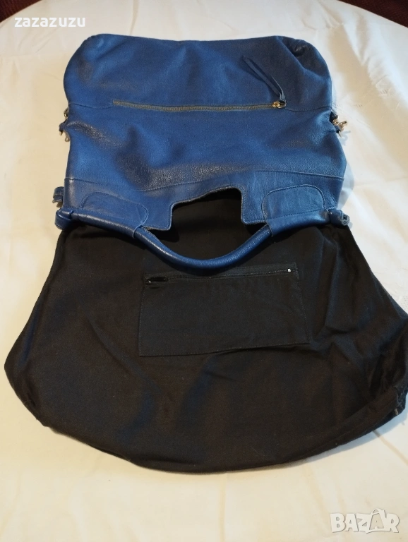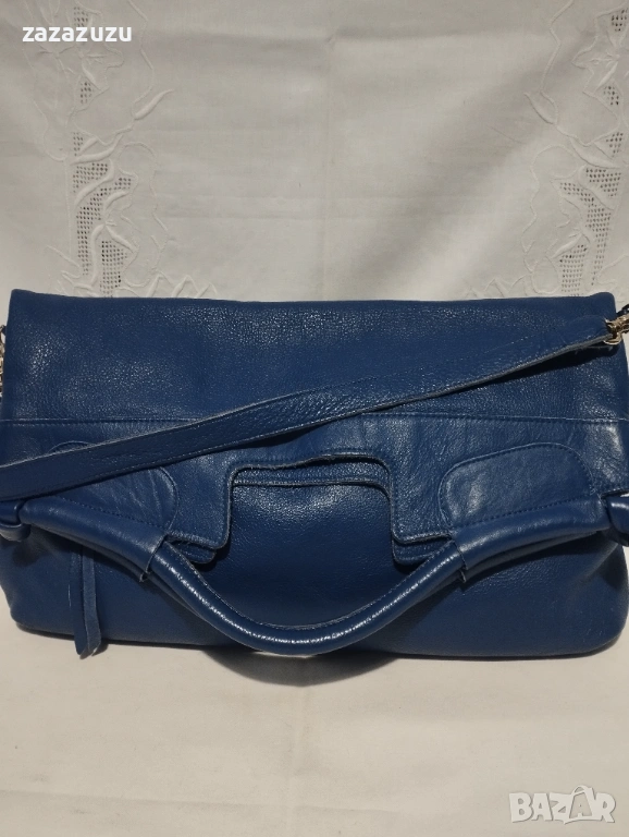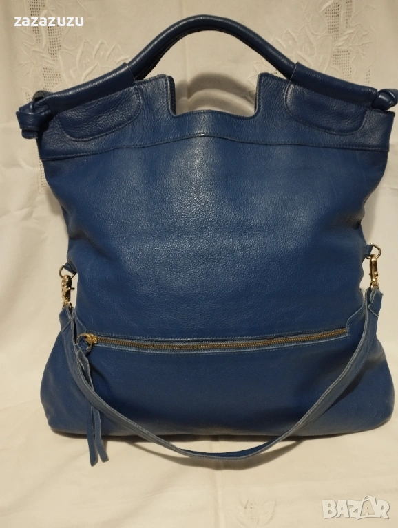 ЕСТЕСТВЕНА КОЖА италианска голяма чанта на ANNA KARINNA, две къси дръжки, една дълга дръжка, която позволява да се носи на рамо. Чантата е синя, два външни джоба с цип и два вътрешни джоба с цип, дългата дръжка се сваля. Може да се носи и като клъч. Ширина на чантата 48см., височина, когато не е прегъната 44см., дължина на дългата дръжка 56см.