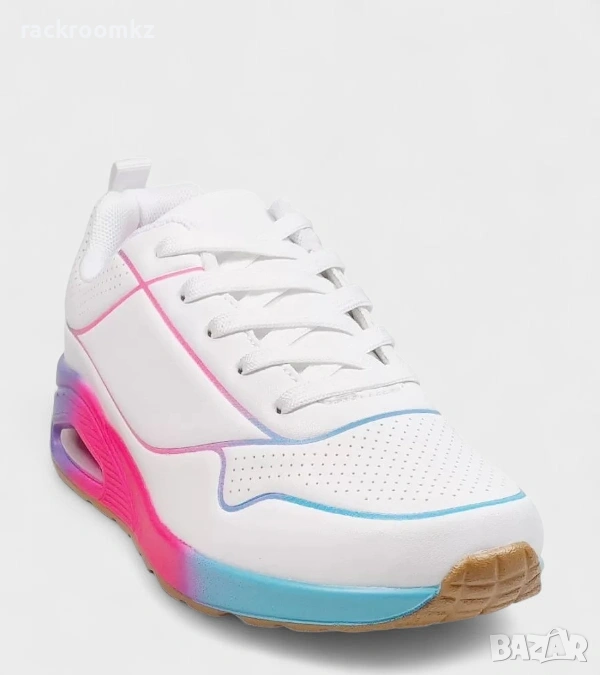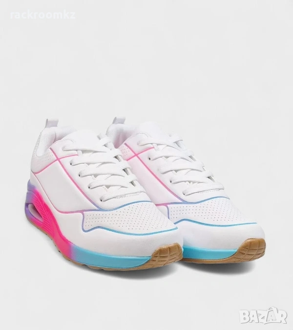 Дамски маратонки D9158-3 white – съчетание от комфорт, модерна визия и уникален дизайн, вдъхновен от популярните модели на Skechers. Изчистеното бяло съчетано с цветен преливен ефект в подметката придава свеж и енергичен вид, идеален за ежедневието. Меката стелка и стабилната подметка осигуряват удобство при всяка стъпка, а модерната форма подчертава индивидуалния стил. Подходящи както за спортно-елегантна визия, така и за динамичното ежедневие.