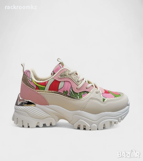 - Комбинацията от розови и червени акценти придава модерен и енергичен вид, а масивната подметка осигурява стабилност и комфорт при всяка крачка.