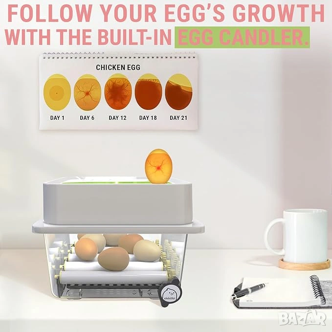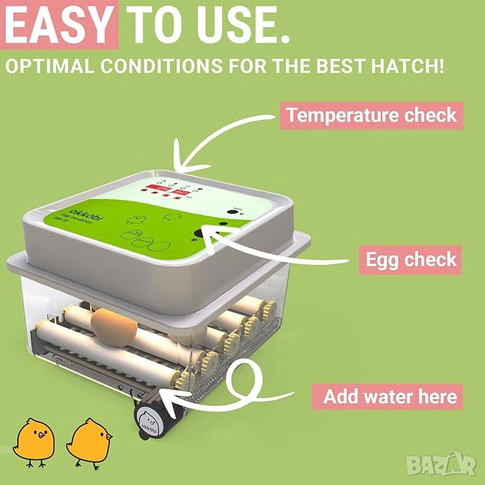 OBI-12 се предлага с лесно за следване ръководство и дигитален панел, който показва точно температурата и влажността. Той е снабден с всичко необходимо за следващото ви излюпване: всичко, от което се нуждаете, са яйца!