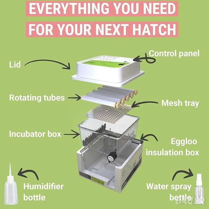Инкубаторът може да бъде настроен да побере 12 кокоши яйца и е снабден с регулируеми въртящи се тръби, които могат да бъдат разположени на разстояние една от друга, за да се поставят малки и големи яйца за кокошки, патици, гълъби и други птици. Няма нужда да се притеснявате за ръчно обръщане на яйцата си на всеки 1,5 часа! Инкубаторът прави всичко това автоматично вместо вас, което значително увеличава процента на излюпване. Вграденият инкубатор за яйца ви позволява да наблюдавате развитието на вашите яйца. Стабилна температура + Допълнителна защита за по-студени дни: Системата за въздушен поток, задвижвана от вентилатора, осигурява стабилно и хомогенно разпределение на температурата в инкубатора, осигурявайки оптимални условия за яйцата. Освен това, отворите за доливане на вода ви позволяват да контролирате влажността, без да отваряте капака, и да избягвате температурни колебания.