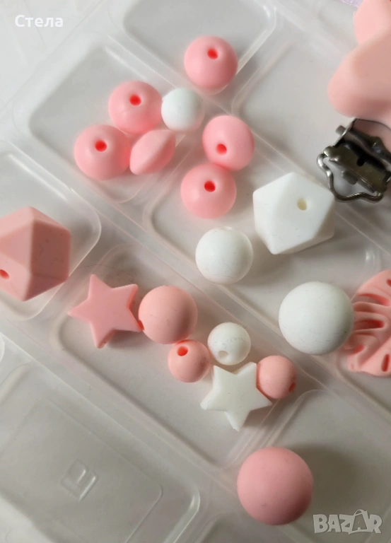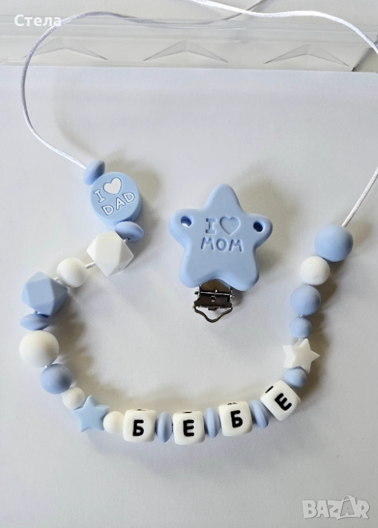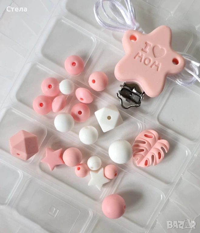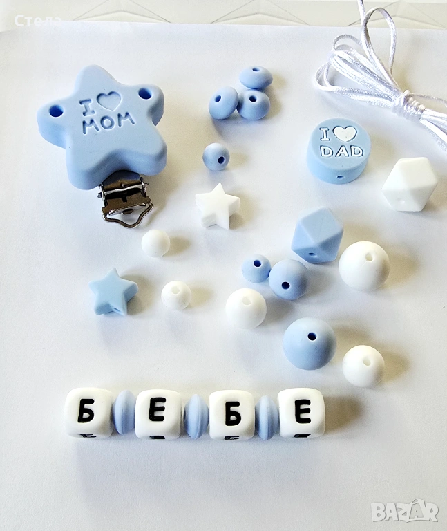 Комплектът съдържа 1бр сил иконов клипс синя /розова звезда с надпис "I love mom" , бял шнур 1.5мм и 21бр различни мъниста в бял и син цвят или розово и бяло.