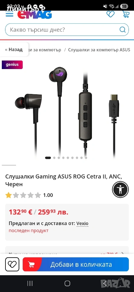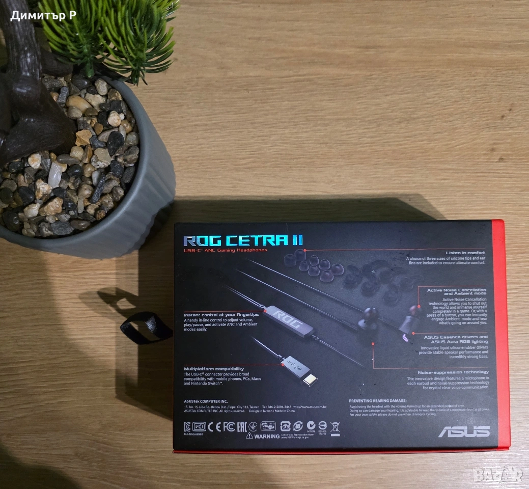 Продавам ASUS ROG Cetra II – висококачествени геймърски слушалки тип in-ear с USB-C връзка и активно шумопотискане (ANC). Подходящи за гейминг, музика и разговори.