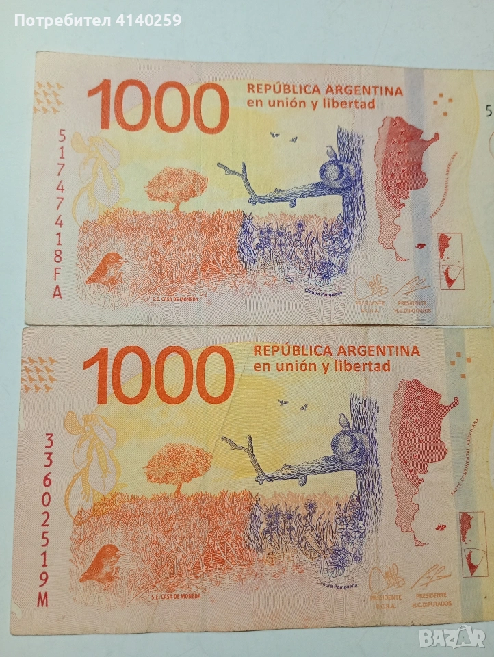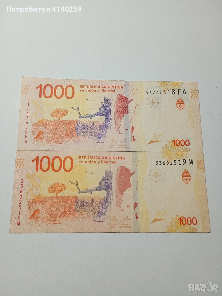 АРЖЕНТИНА БАНКНОТИ 1000 ПЕСО 2017 Г ЦЕНА ЗА 2 БРОЯ СЪСТОЯНИЕ ОТЛИЧНО ПОЛУЧАВАТЕ СНИМАНИТЕ БАНКНОТИ РАЗГЛЕДАЙТЕ ДРУГИТЕ МИ ОБЯВИ ДА КОМБИНИРАТЕ ДОСТАВКА ЕКОНТ ЗА ВАРНА ЛИЧНО