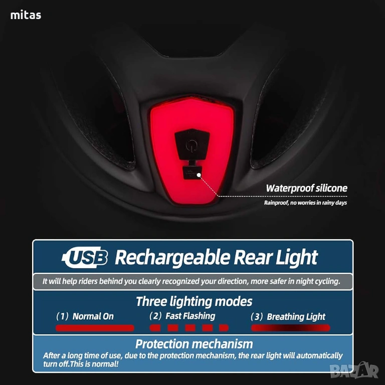 - Превъзходна нощна видимост: Трите режима на LED светлината гарантират, че сте ясно забележими за водачите на МПС, като помагат за поддържане на безопасна дистанция при нощно колоездене.