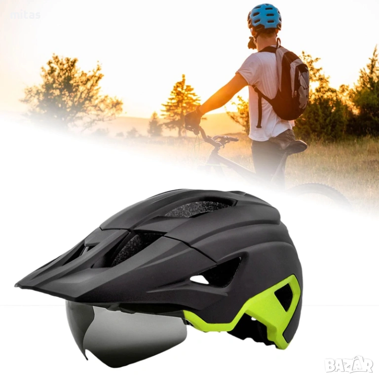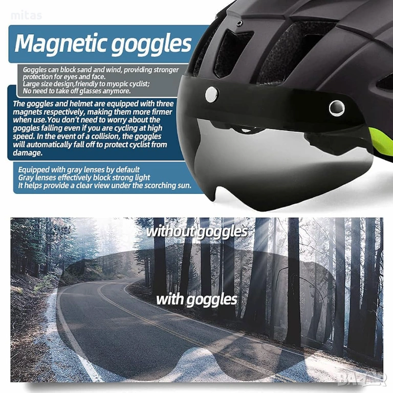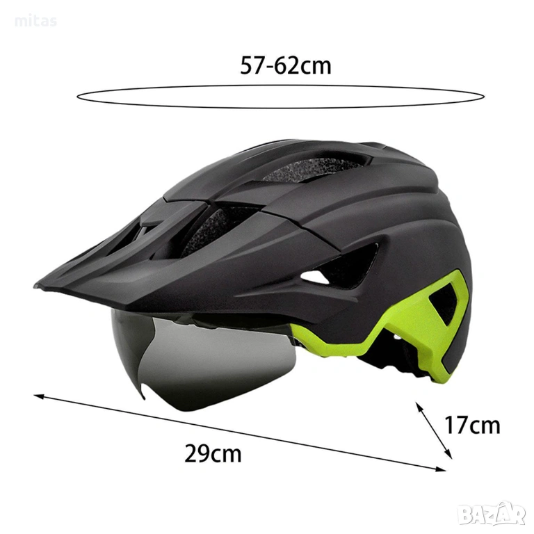 Тагове: вело каска, каска с LED светлина, каска с магнитни очила, аксесоари за велосипеди, предпазна каска за тротинетка, велосипедна каска M/L, USB светлина за каска, безопасно колоездене, MTB каска със сенник.