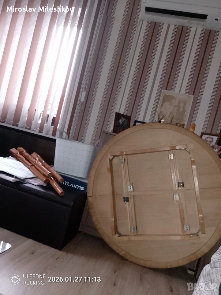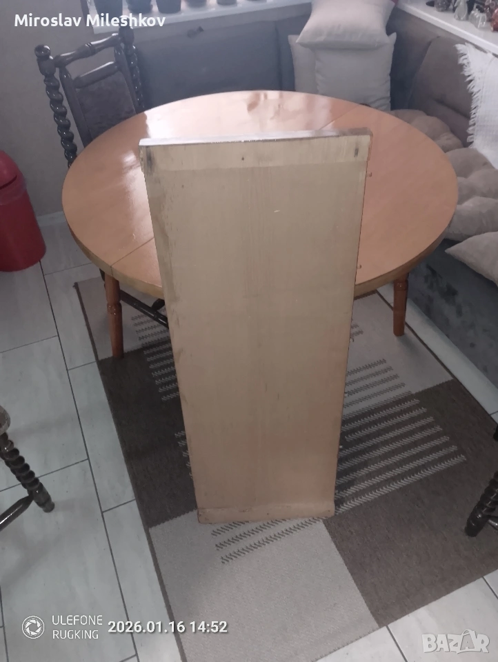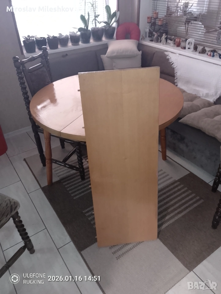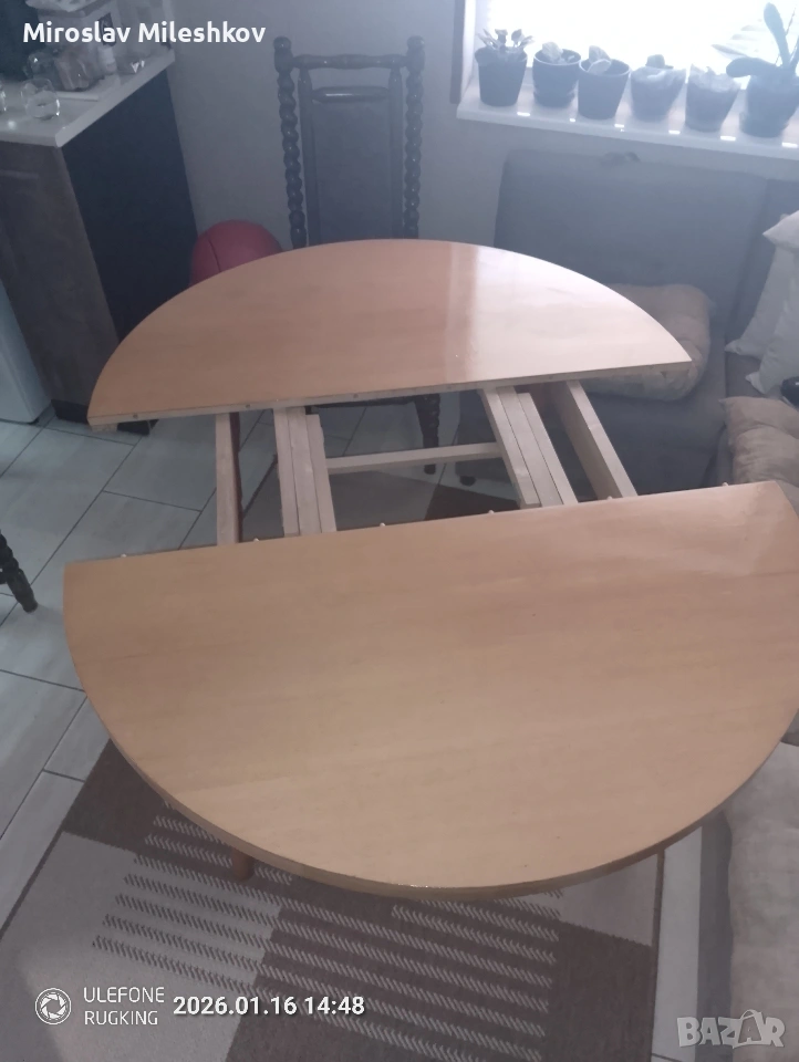 продавам масата защото си купих друга и тази ми е излишна вече разтваря се добре само дъската допълнителната явно много малко се е изметнала и си трябва малко мъжка сила за да влезат диблите в дупките това и е кусура размера и е 110 а в разгънато състояние е 140