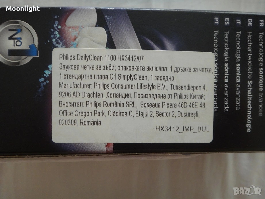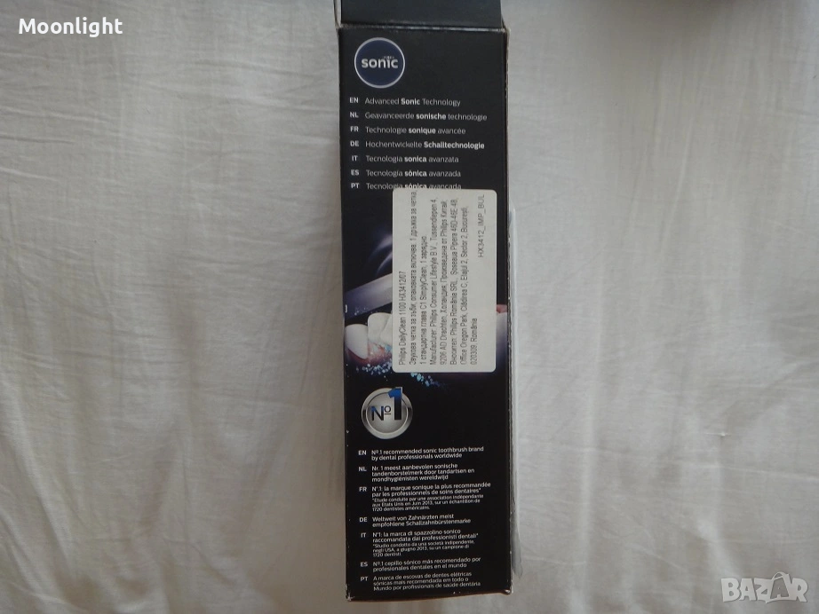 Електрическа звукова четка за зъби Philips Sonicare DailyClean 1100 HX3412/07 е електрическа звукова четка за зъби с 1 режим на работа - Clean, за ефективно ежедневно почистване. Електрическа звукова четка за зъби Филипс Соникеър ДейлиКлийн 1100 ХХ3412/07 отлично почиства зъбите, благодарение на подобрената звукова технология Sonicare, която завихря вода между зъбите, а главата на четката отстранява плаката. Разполага със Smartimer - таймер, който засича препоръчителните две минути за миене на зъбите, и QuadPacer – който сигнализира, когато е време да минете към следващата област на зъбите за почистване. Отличава се с програмата Easy-start, осигуряваща възможност за постепенно и деликатно увеличаване на мощността на почистване за първите 14 пъти използване на новата четка с цел по-лесното свикване с нея. Тази електрическа четка за зъби отстранява до 3 пъти повече плака в сравнение с обикновения четки за зъби. Батерията издържа до 14 дни без презареждане, а главата на четката се сваля и слага лесно с цел поддържането на по-добрата й хигиена. Дръжката е с ергономичен дизайн, правещ миенето на зъбите още по-приятна дейност. Скоростта на четката е до 31 000 движения в минута, а напрежението - 110 – 220 V.
