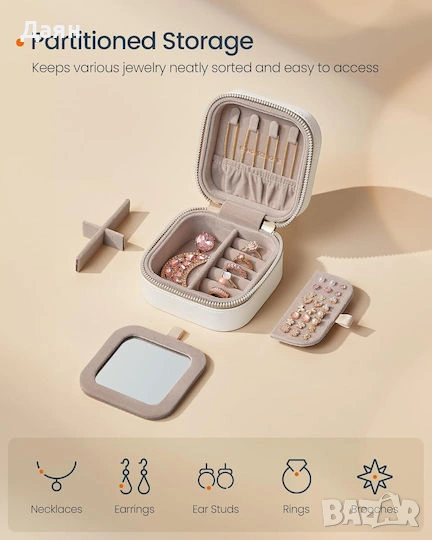 Вземете стила си в движение с тази малка кутия за бижута с размери 10,5 x 10,5 x 6 см – идеална за поставяне във всяка чанта или багаж. Предлага се с удобно огледало за корекции на грима и плавни ципове за лесен достъп.