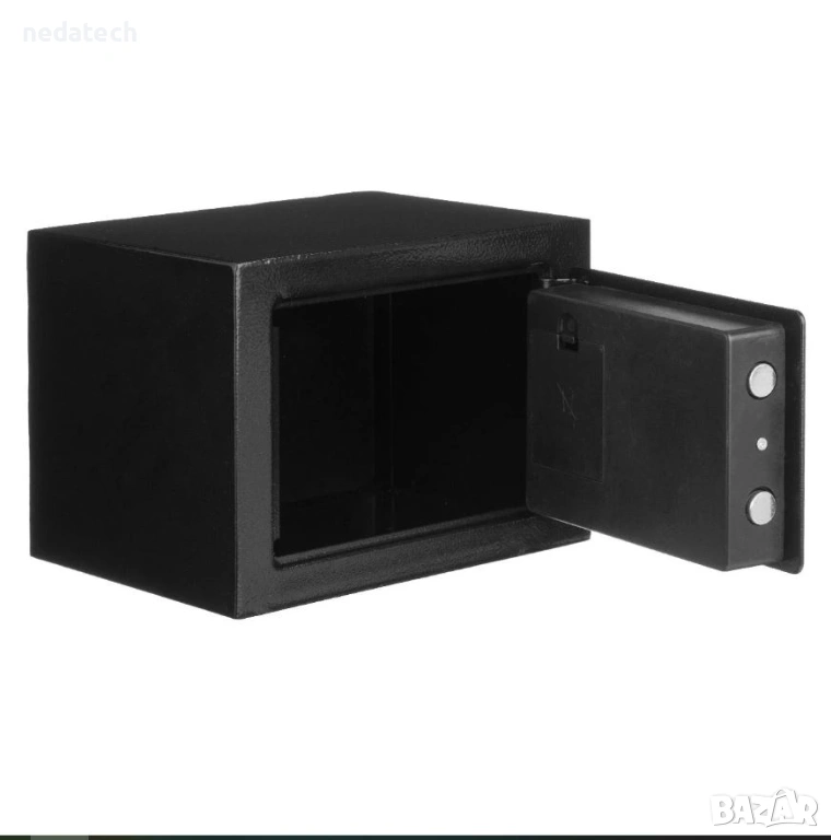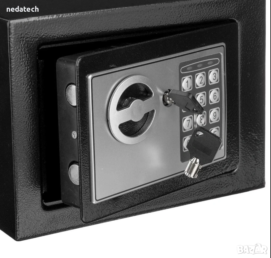 Сейф с ключ и цифрова комбинация. Изработен е от стомана и може да се постави навсякъде (под, гардероб, чекмедже) или дори да се монтира на стена през отворите на гърба. От вътрешната страна на вратата се намира слотът за батерии за цифровия панел, за да се покаже желаната комбинация (следвайте инструкциите). Работи с 4 батерии тип AA (не са включени). Отворът на вратата е 18x13 см.