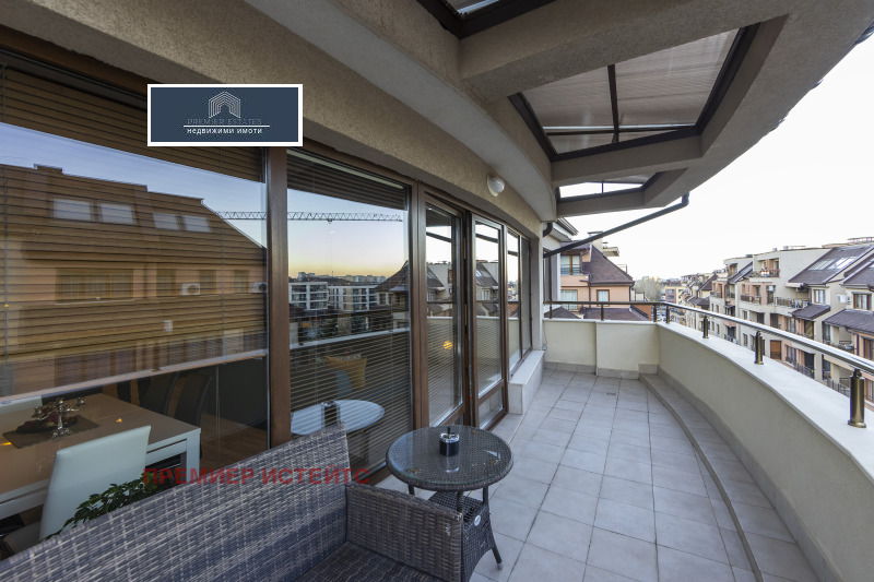 Апартамента е със следното разпределение: входно антре, от което се влиза в просторен хол с трапезария и обособен кухненски бокс, оборудван с висок клас електроуреди, от който се излиза на просторна тераса.Отличителна черта на апартамента е и неговата южна тераса, която предлага панорамна гледка към Витоша. Тук можете да се наслаждавате на сутрешното си кафе.От хола по коридор се стига до родителска спалня със собствена баня и тоалетна, втора спалня с излаз на тераса, трета спалня или кабинет, баня с тоалетна за двете спални и отделна тоалетна за гости.