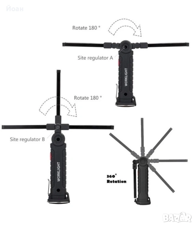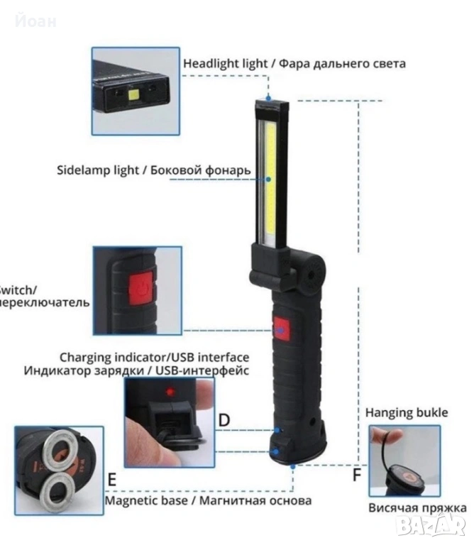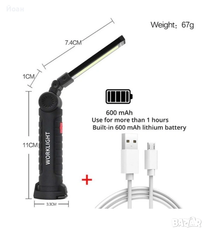 Лампата разполага с мощен магнит в долната част на дръжката и кука за закачване, което я прави удобна за закрепване на различни повърхности. Осветителната част на лампата може да се движи на 270 градуса, предоставяйки гъвкавост при насочването на светлината. Влагозащитените бутони за включване гарантират надеждна работа дори в влажни условия. Лампата разполага с три режима на осветяване - силно и слабо осветяване с COB диодна лента и фенерче на върха на лампата. Лампата осигурява мощна светлина с ниска консумация на енергия.
