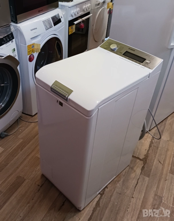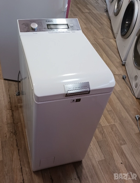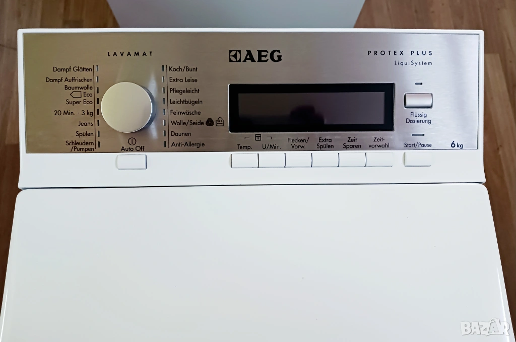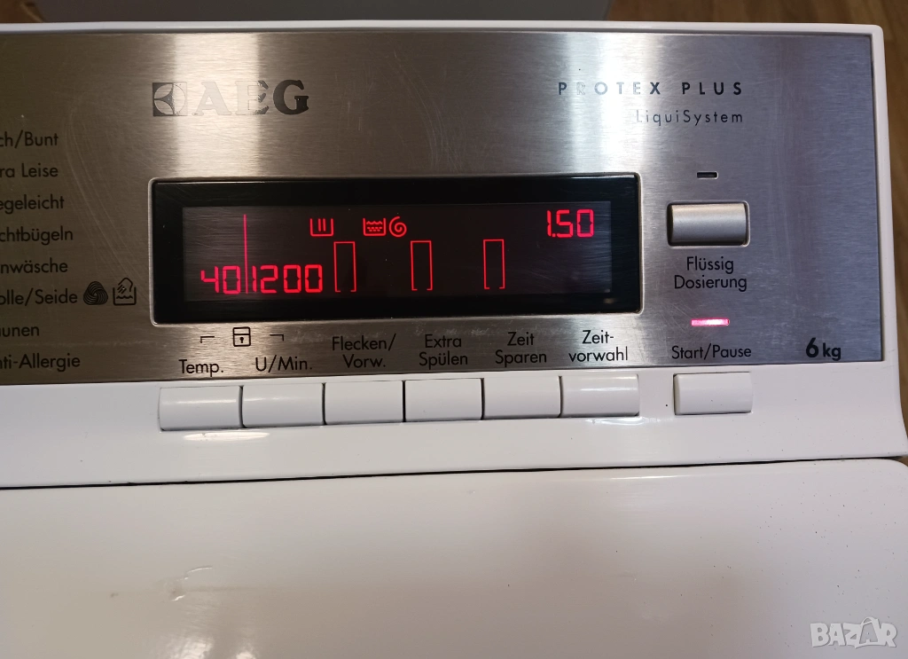 Пералня AEG PROTEX PLUS - с горно отваряне, произведена за немския пазар / клас А++ / капацитет 6 кг. / 1500 оборота / с 16 основни програми ( с пара,памук, синтетика, вълна, финни, еко, антиалергична, лесно гладене, олекотени, 20 мин. - 3 кг и др.) + допълнителни ( предпране, избор на центрофуга и на температура, отложен старт, за петна, икономия на време, допълнително изплакване и др.) + голям LCD дисплей с оставащо време и бутони включено/изключено и старт/пауза.