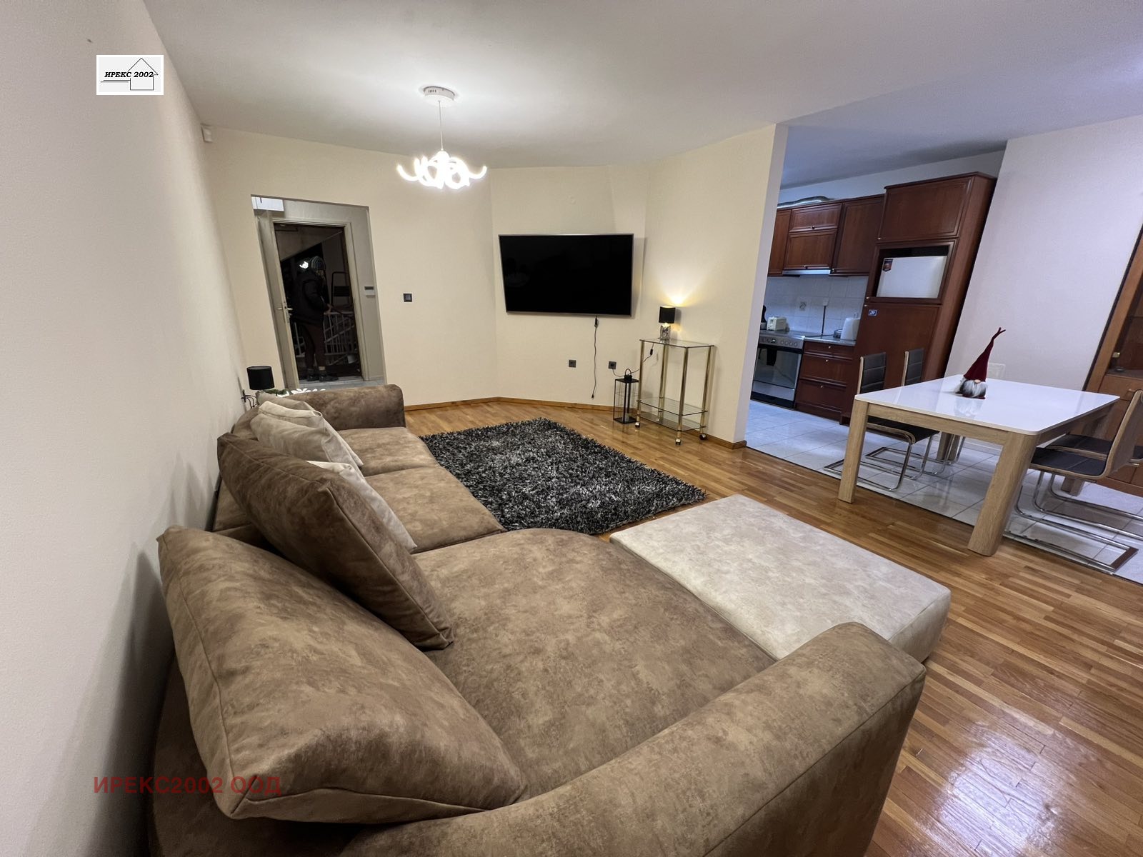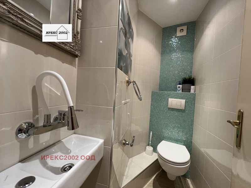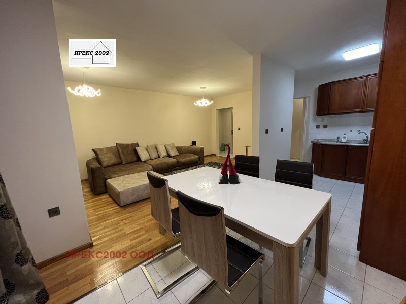 Голяма дневна с трапезарна част и кухненска зона, две просторни непреходни спални, две бани с тоалетни, три тераси и включен в наемната цена НАДЗЕМЕН ГАРАЖ. В имота не се допускат домашни любимци!