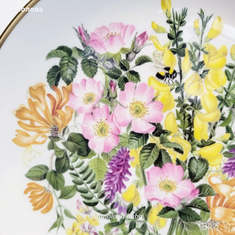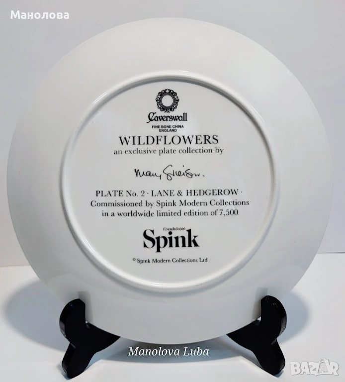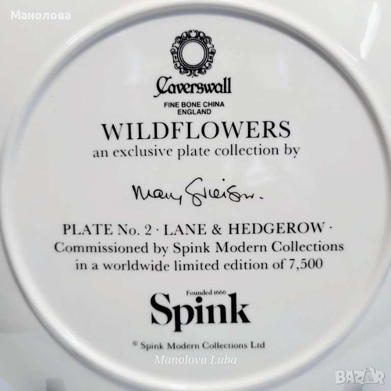 Чинията е ръчно рисувана, на задната част е подписа на Mary Grierson - шотландска ботаническа художничка и илюстраторка. Ограничено издание от 7500 чинии, произведени и продавани по целия свят. От поредицата WILDFLOWERS, номер 2 LANE & HEDGEROW.